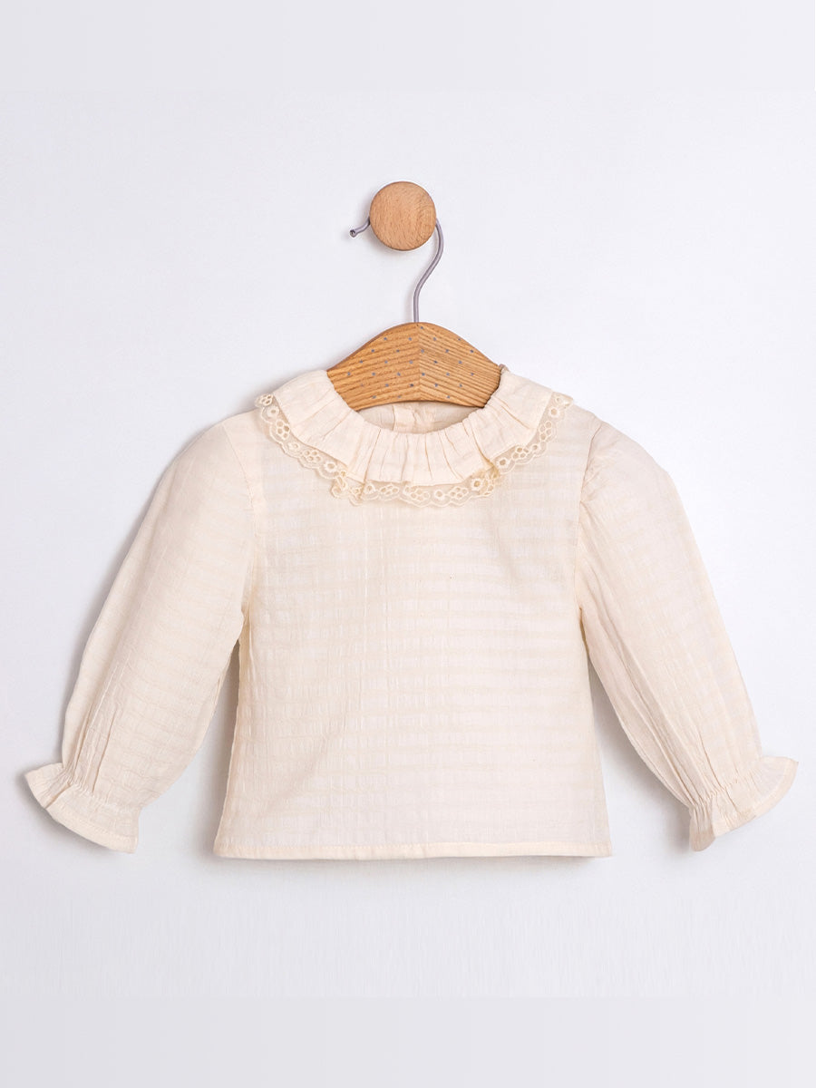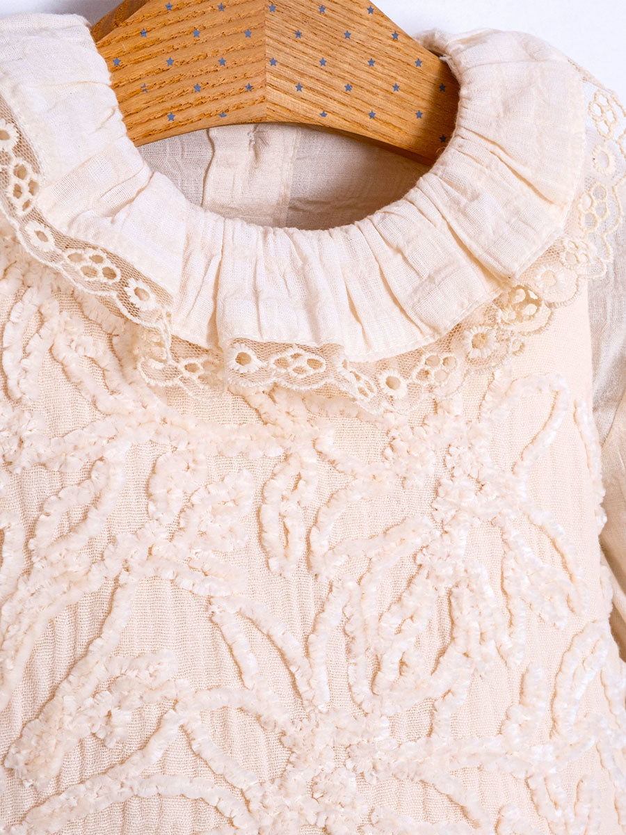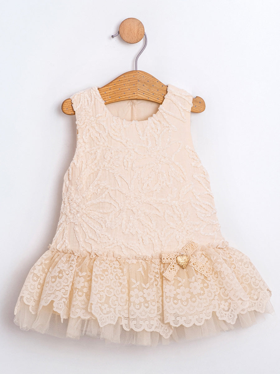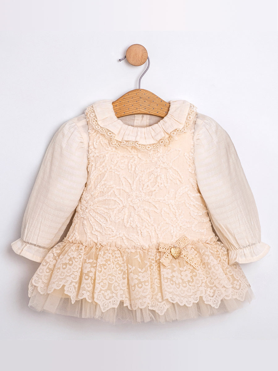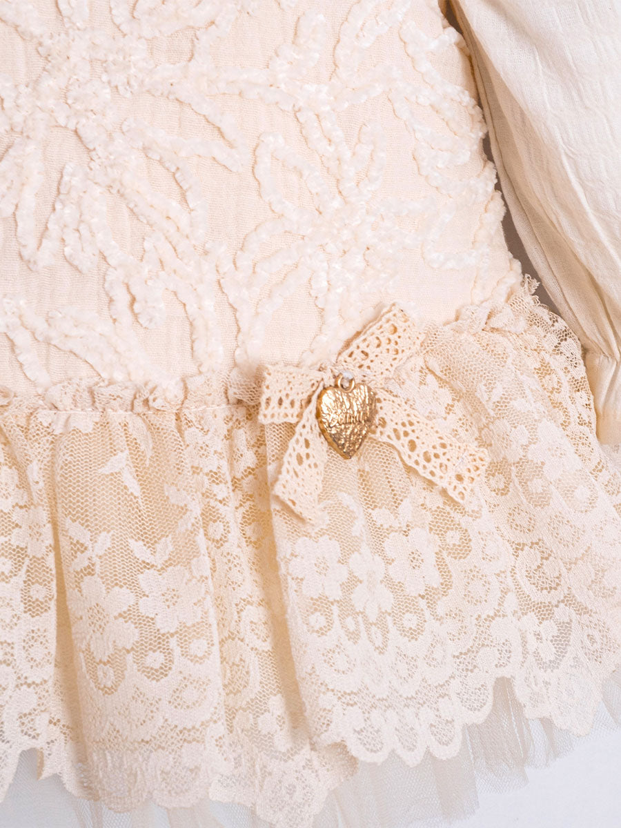 Das Kleid zeichnet sich durch eine reiche Textur, Spitzenrüschen und Tüll am Saum aus, der ihm zusätzliches Volumen und ein festliches Aussehen verleiht. Ein besonderes dekoratives Detail ist die Schleife mit goldenem Herz auf der Vorderseite. Die langärmelige Bluse ergänzt das Set mit ihrem zarten Rüschenkragen und der Spitzenborte, die dem Modell zusätzliche Eleganz und klassischen kindlichen Charme verleihen.