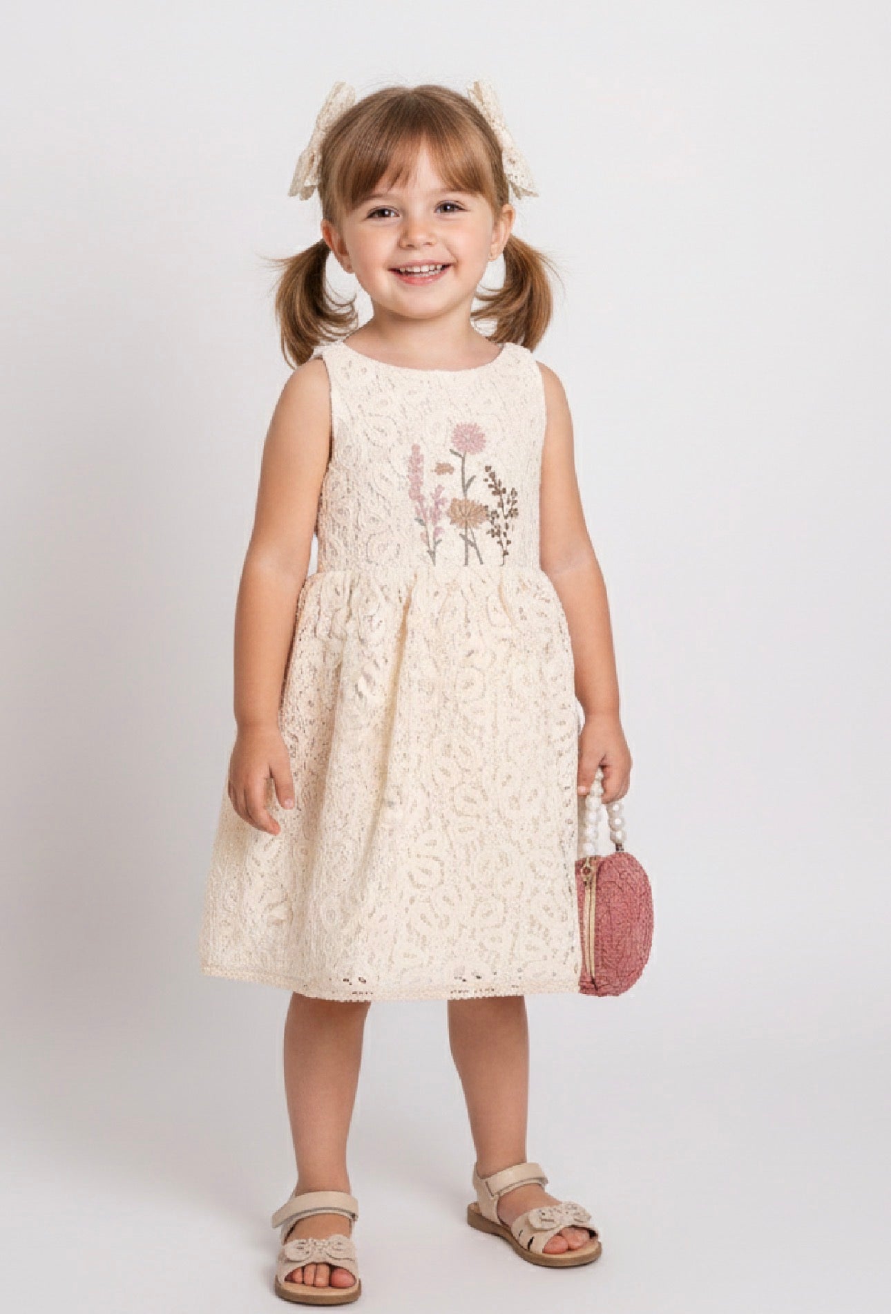 Das Cumino Lora Girl Dress ist ein elegantes Kinderkleid für Mädchen, das romantisches Design und raffinierte Details vereint. Das Modell in einem zarten Cremeton zeichnet sich durch eine reiche Spitzenstruktur, dezente Blumenstickereien auf der Vorderseite und eine prächtige Schleife am Rücken aus, die dem Kleid einen besonderen festlichen Charakter verleiht. Zum Kleid gehört auch eine dekorative Handtasche mit einem auffälligen Perlenhenkel, perfekt als stilvolles Accessoire für besondere Anlässe.