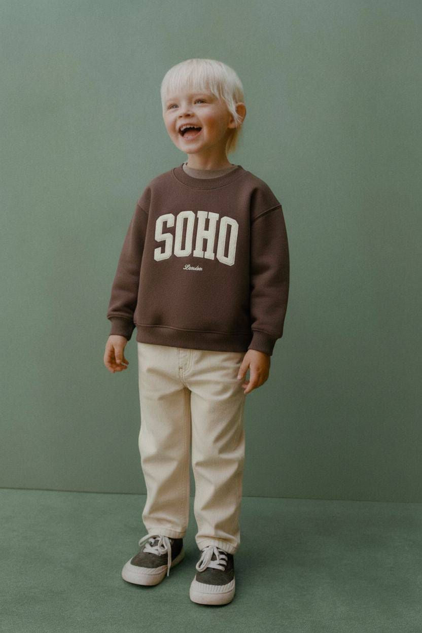 Das Kinder-Sweatshirt La'ciel Paris in einem warmen Braunton mit großem SOHO- Schriftzug und dezentem London- Detail besticht durch seinen minimalistischen College-Stil, den bequemen Schnitt und die gerippten Bündchen – ideal für Schule, Kindergarten und Alltag.