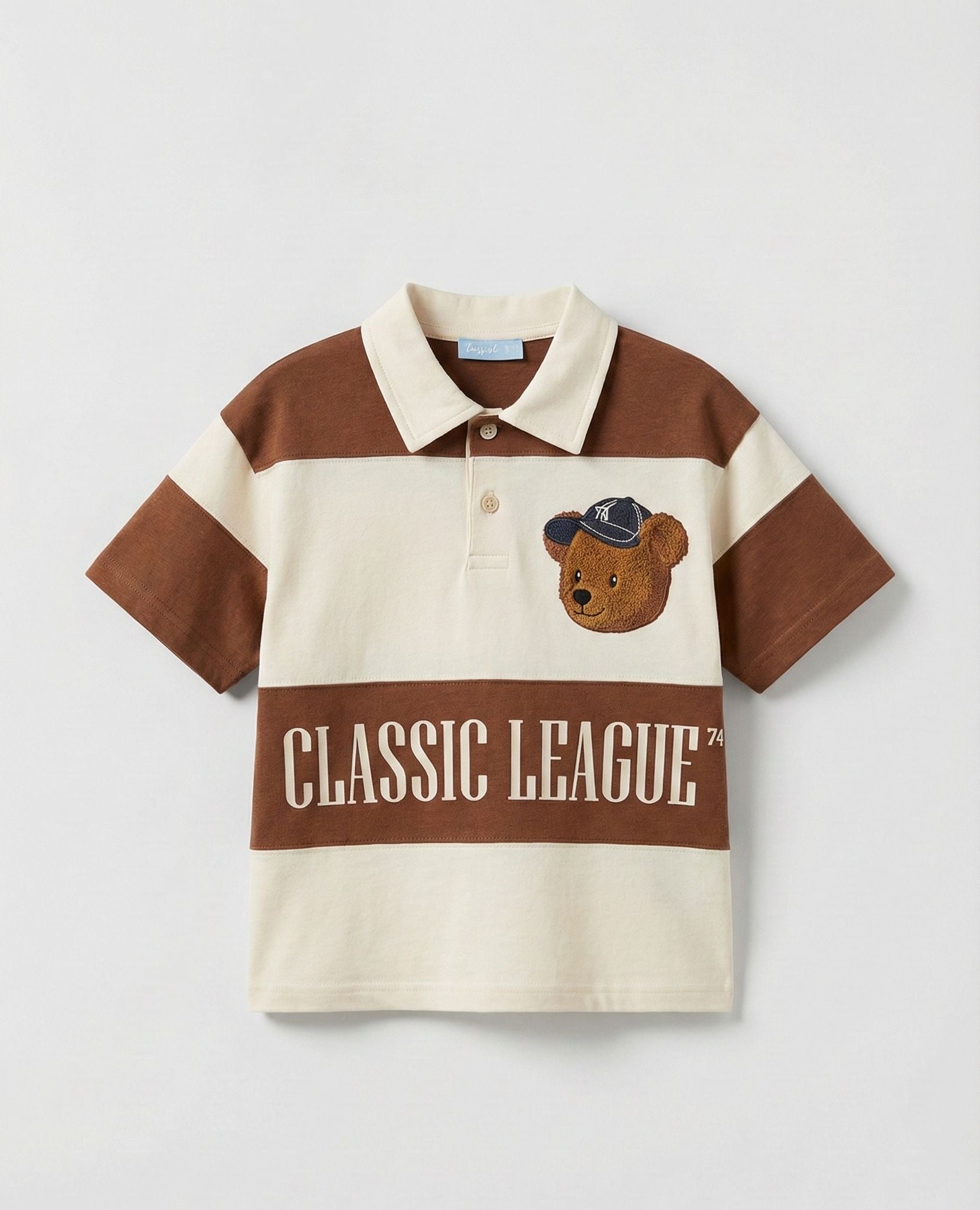 Dieses Kinderpoloshirt von La'ciel Paris in Creme und Braun gestreift besticht durch den auffälligen Schriftzug „CLASSIC LEAGUE 74“ und eine Teddybär- Applikation auf der Brust. Es wirkt elegant wie ein Hemd, trägt sich aber so bequem wie ein T-Shirt.