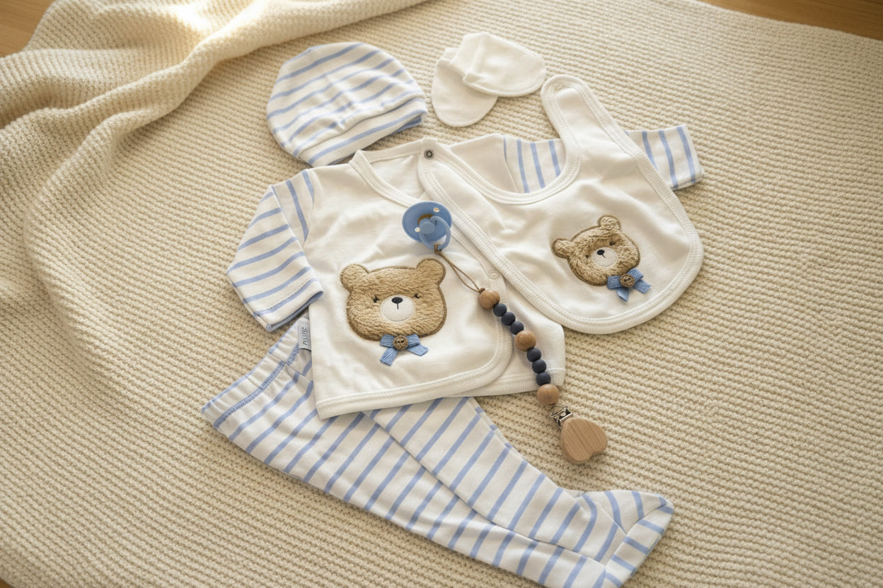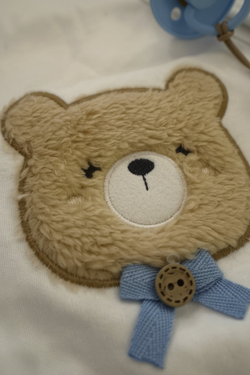Ovaj pažljivo dizajniran baby set donosi savršenu ravnotežu između funkcionalnosti i estetike. Kombinacija bijele i nježno plave boje, uz simpatičan teddy motiv, stvara sofisticiran i topao izgled koji odiše kvalitetom.