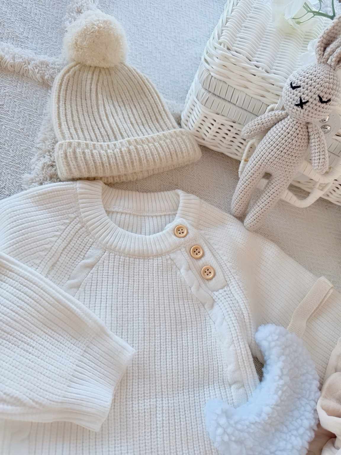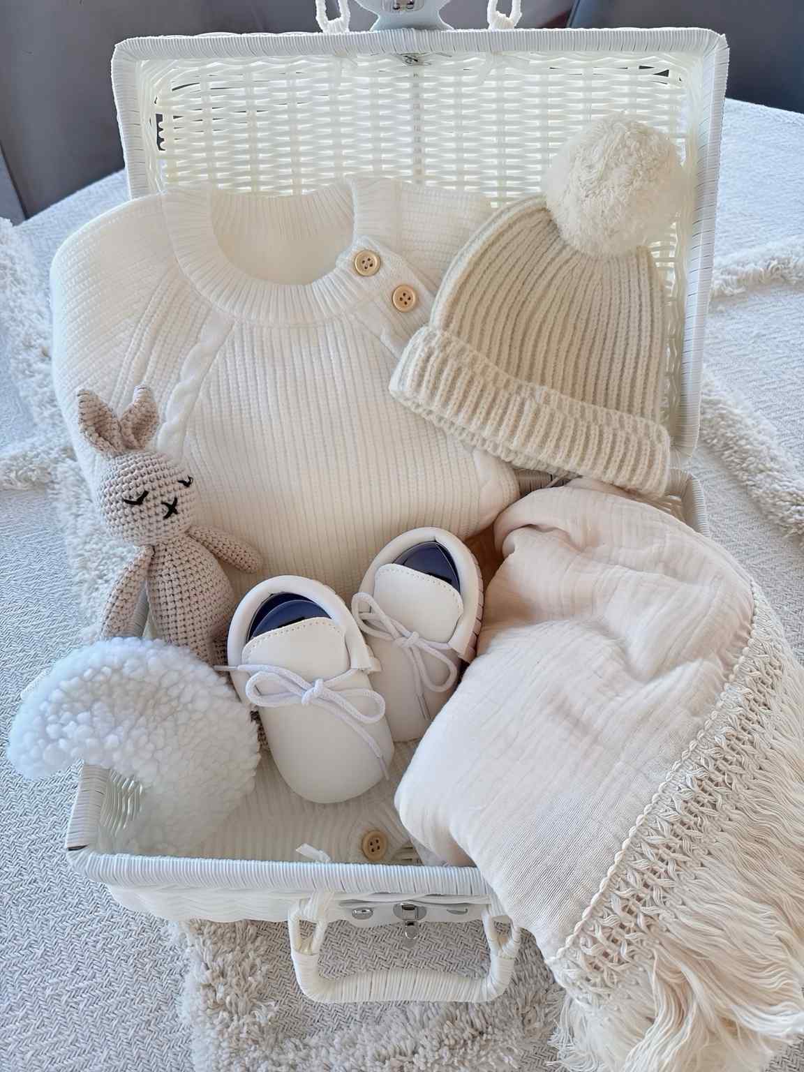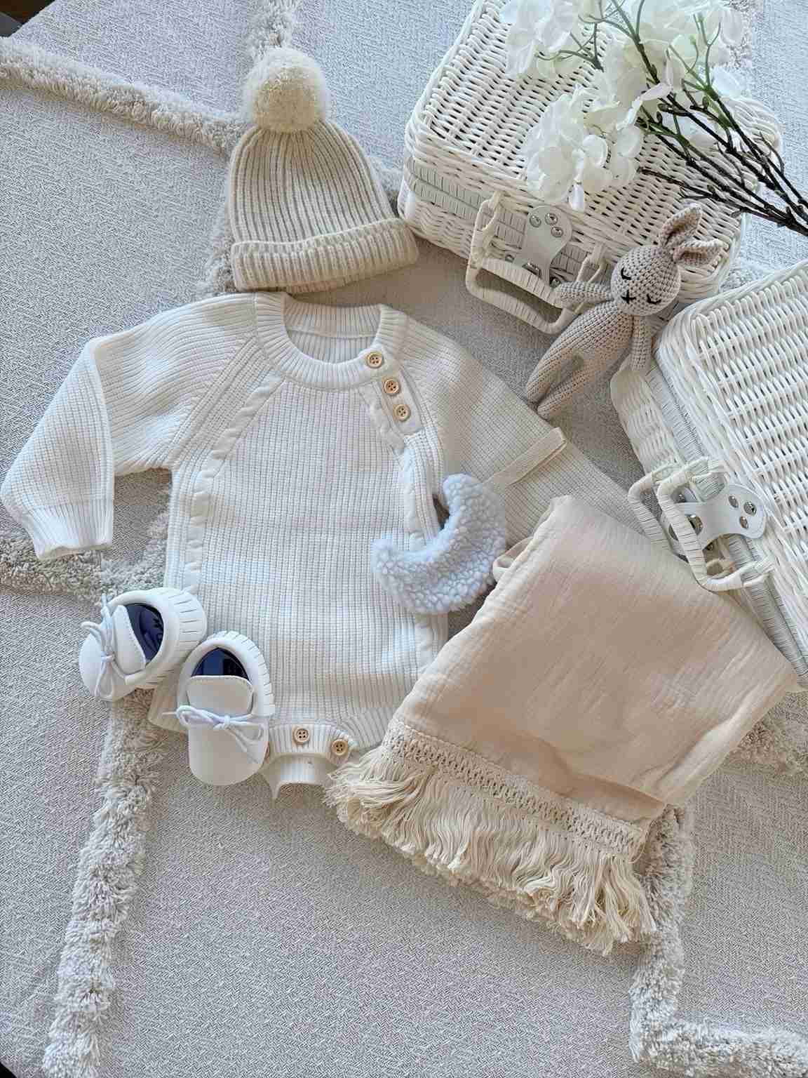 This beautiful gift set comes in a practical 30 x 20cm case , is a highly aesthetic, neutral and extremely photogenic set for the first days of your baby. The white-cream palette, soft materials and carefully selected details make this set an ideal choice for a maternity leave, christening, baby shower or professional newborn photography.