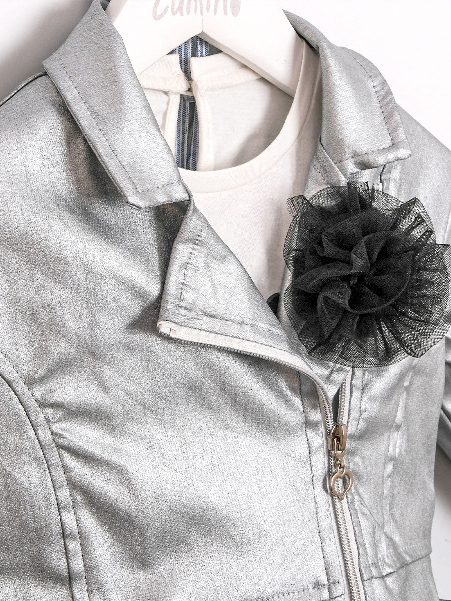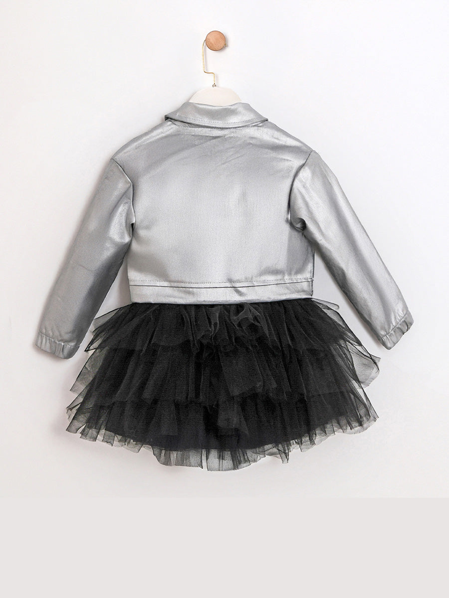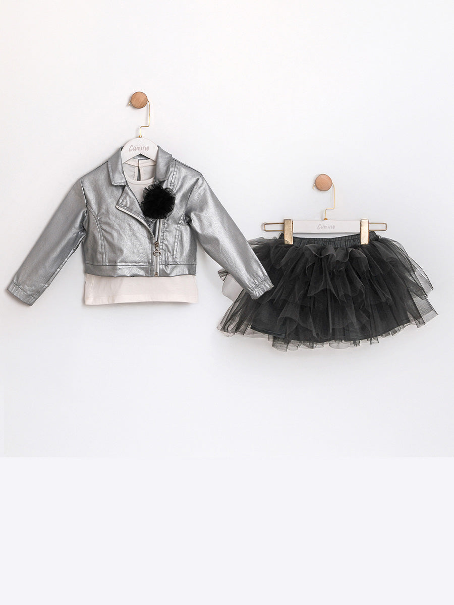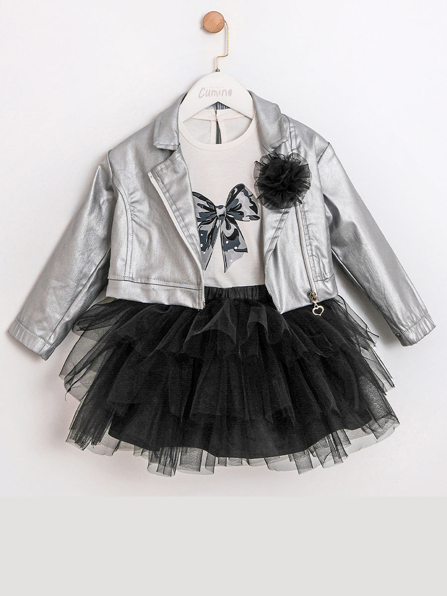 An elegant 3-in-1 set for colder days: a cotton bodysuit for softness on the skin, a breathable tutu skirt with cotton lining for a neat fit, and a structured jacket in a mixture of polyester and viscose for the final "polished" look. Designed for ages 2–5; ideal for festive moments and daily combinations