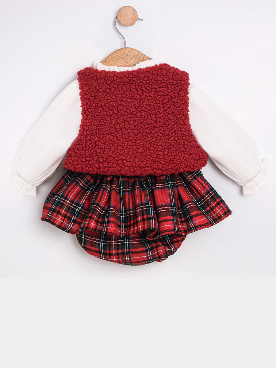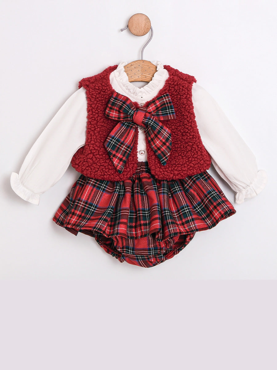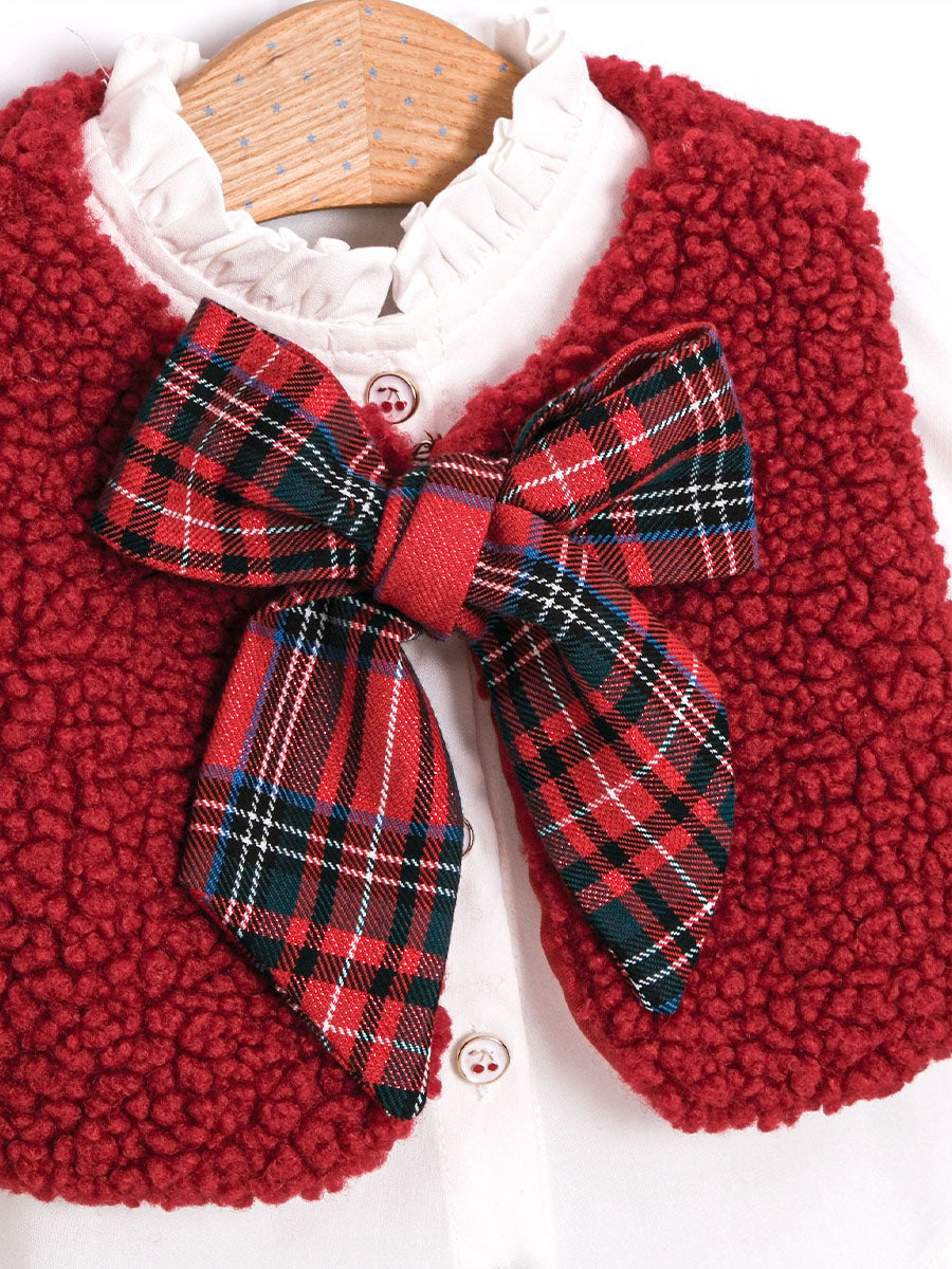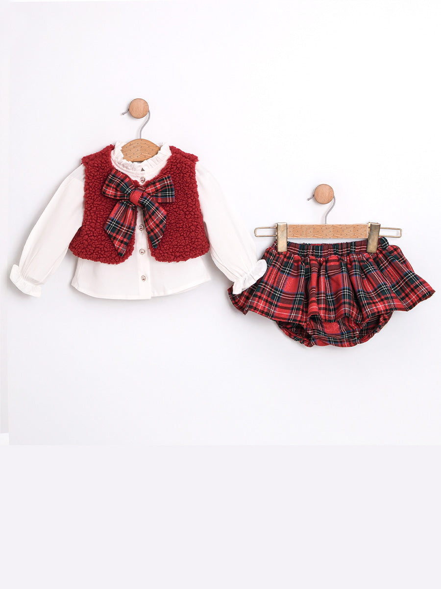 A neat three-piece set for cooler days: a cotton shirt for softness on the skin, a structured vest with cotton lining for a neat fit, and shorts with a discreet lurex effect for a more festive touch. The ideal solution for autumn-winter combinations in sizes 6–18 months