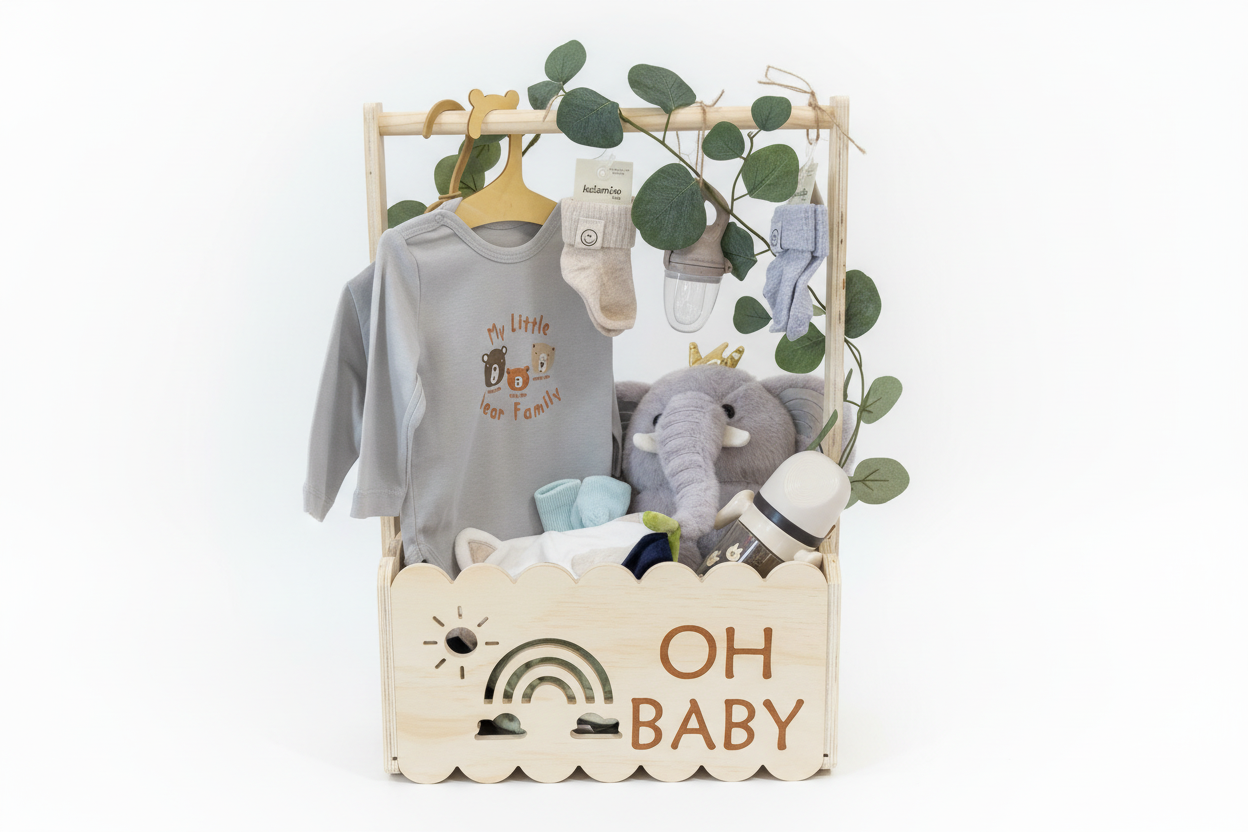 Our wooden "Oh Baby" gift box is the perfect choice for a baby shower, birthday or new baby shower. Made of quality wood, with decorative sun and rainbow details, this box offers countless possibilities - you can use it alone or turn it into a personalized gift set.