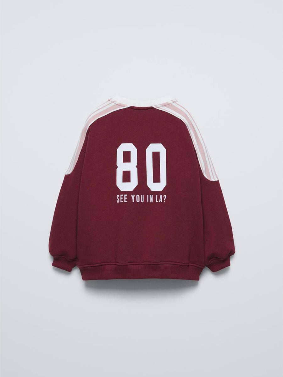 The burgundy La'ciel Paris tracksuit with the "Los Angeles" theme combines a sporty look and playful childish details: the upper part is dominated by the inscription LOS ANGELES and the number 80 , along with decorative floral motifs, while the sleeves feature bright stripes that give a "college" feel. The lower part follows the same visual direction and rounds out the set as a set for school and every day.