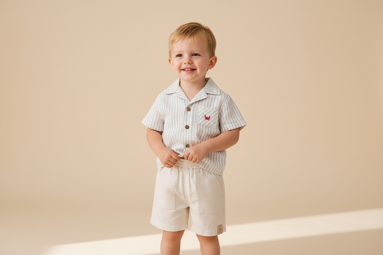 This beautiful two-piece set is designed for boys aged 9 to 24 months, perfect for warm spring and summer days. The combination of natural materials and classic design makes it an ideal choice for festive occasions and everyday wear.
