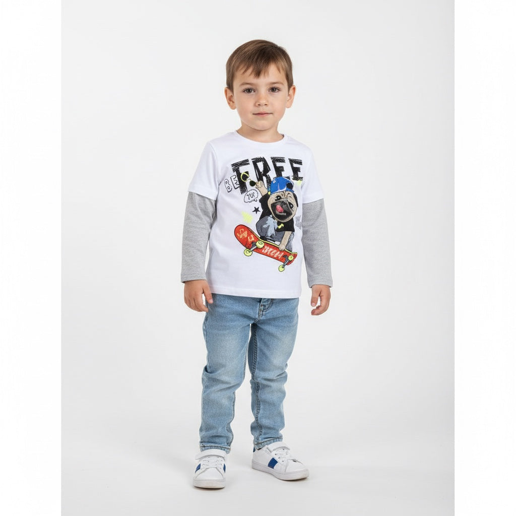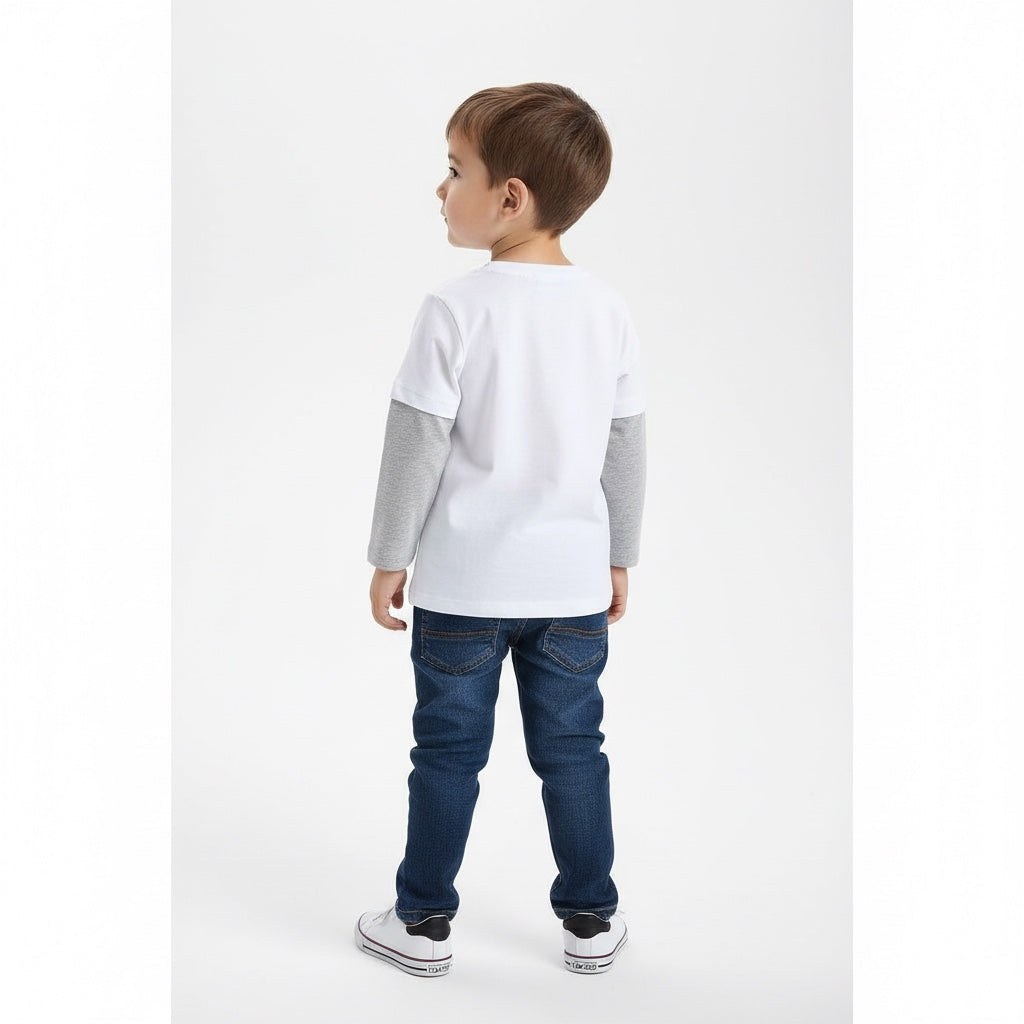 Ova bijela majica s dugim rukavima predstavlja elegantan komad odjeće za dječake. Izrađena je od 100% pamuka, što joj daje poseban osjećaj mekoće. Ima dobro rastezljiv okrugli izrez, koji omogućava udobno nošenje.