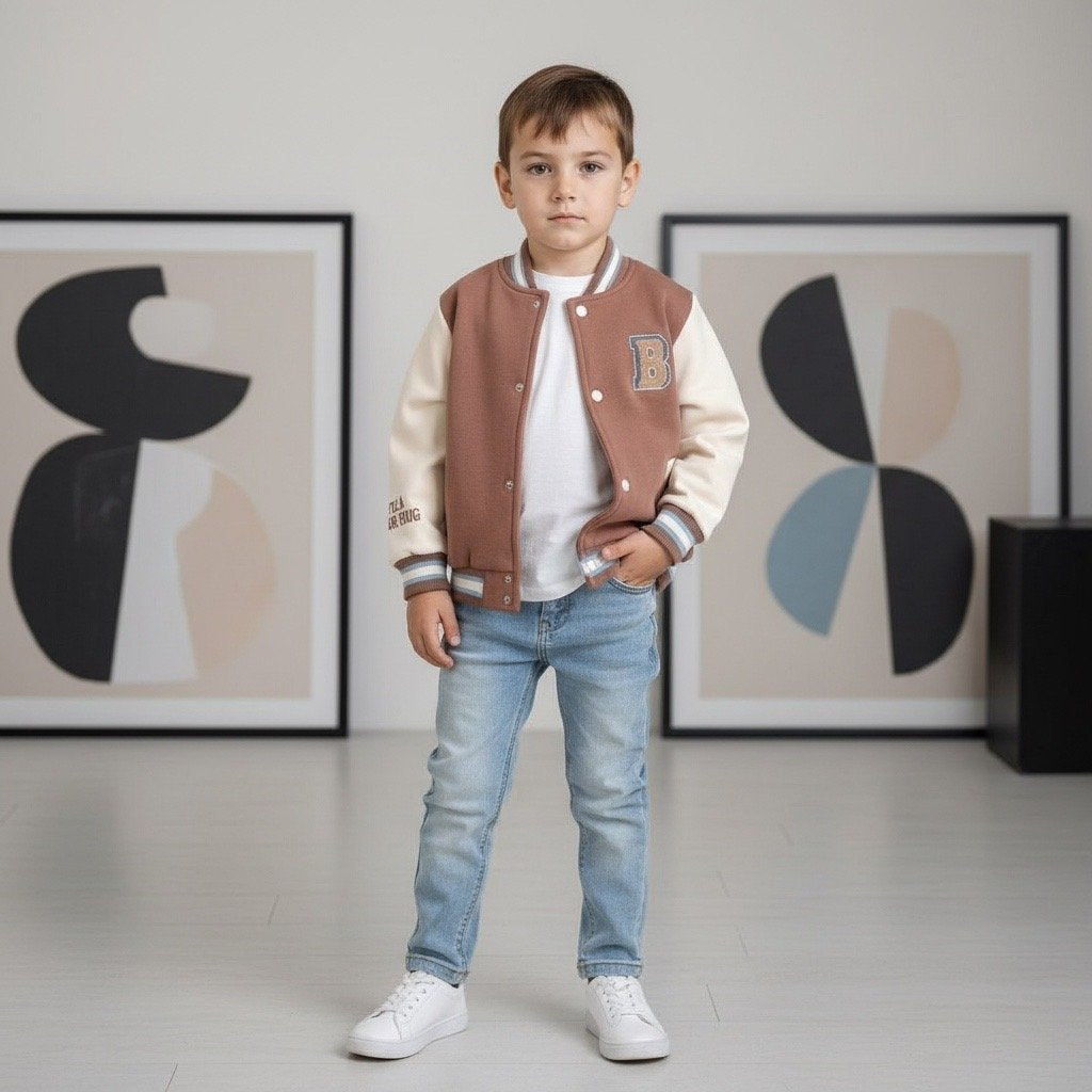 Ova šarmantna college jakna s motivom mede u toplim smeđim tonovima savršen je dodatak garderobi svakog dječaka. Klasičan sportsko-elegantan dizajn inspiriran univerzitetskim stilom donosi moderan izgled, dok detalji s aplikacijama i natpisima dodaju razigran karakter.