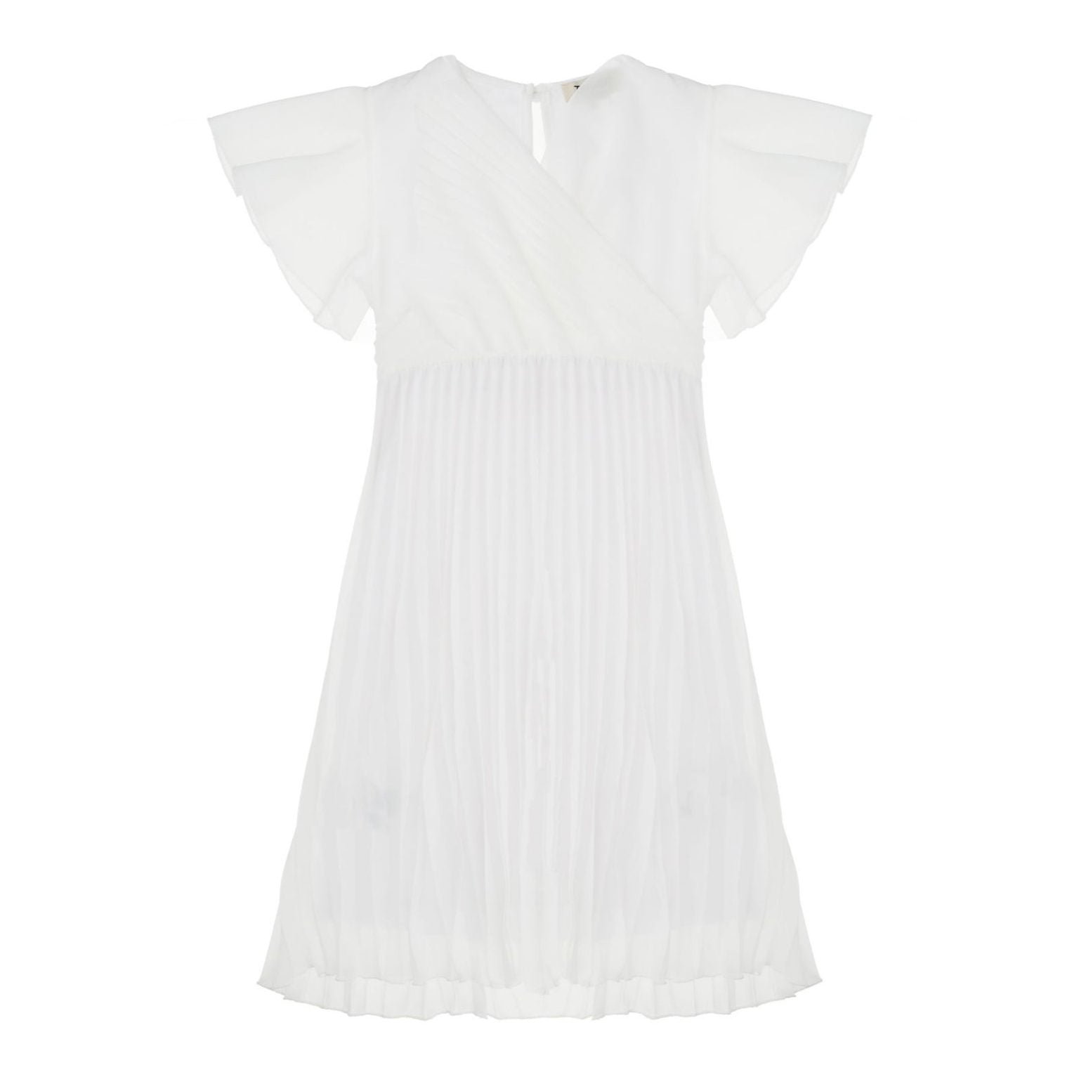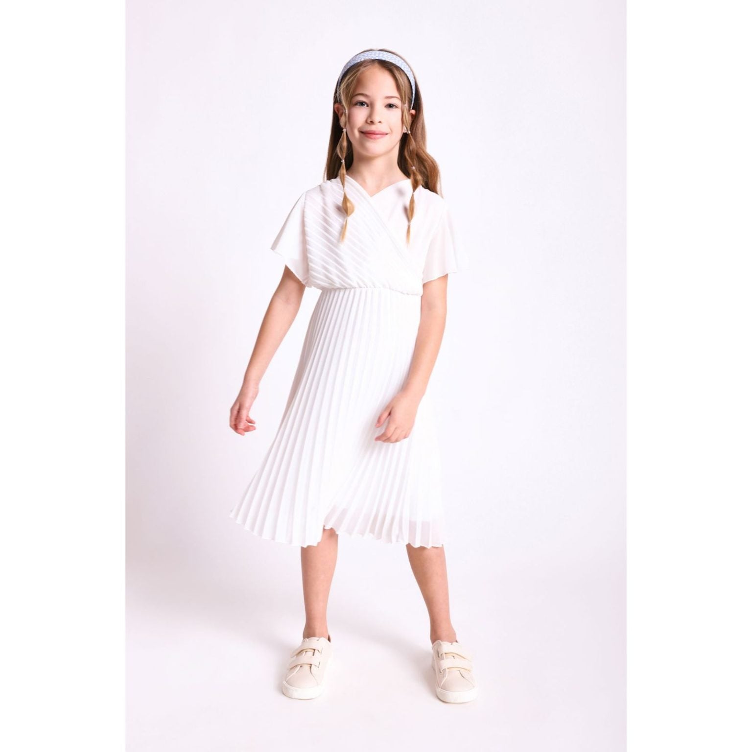 Elegantna Dixie dječja haljina izrađena u Italiji predstavlja spoj modernog dizajna i vrhunske kvalitete izrade. Model u klasičnoj bijeloj boji odlikuje se profinjenim detaljima poput prekriženog (wrap) izreza, laganih kratkih rukava s volumenom te plisirane suknje koja haljini daje prozračan i romantičan izgled.