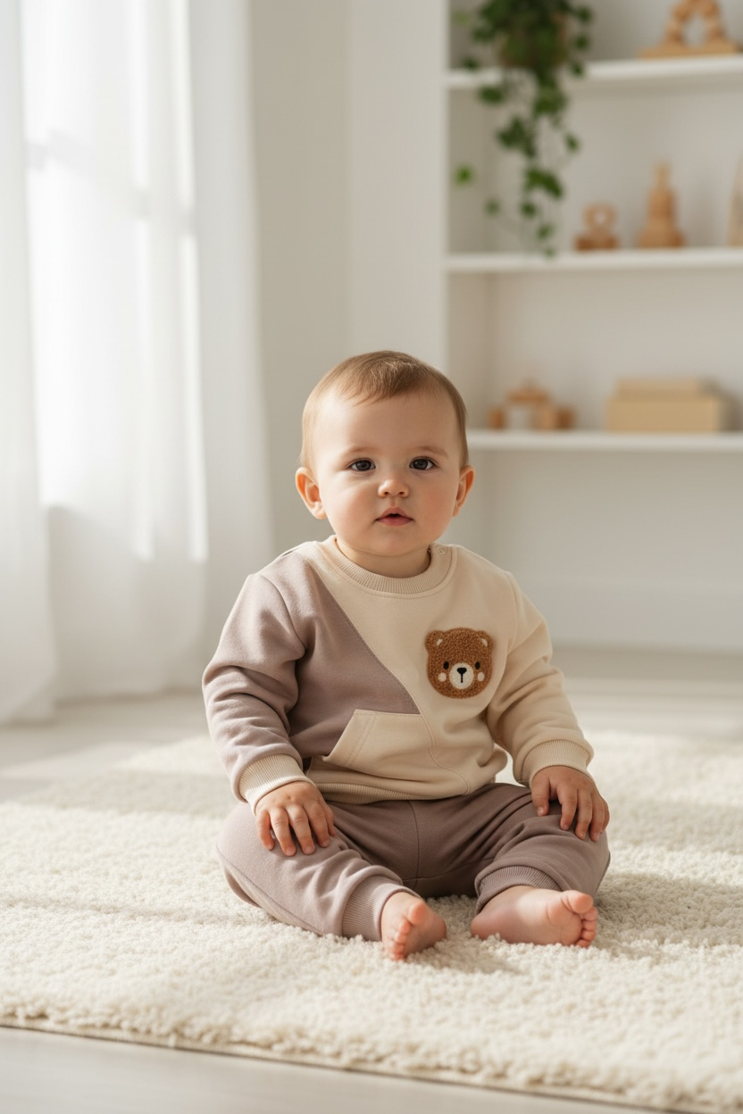 Udobna dječja trenirkica za svaki dan – komplet koji uključuje duksericu s preslatkom aplikacijom medića i mekane hlačice s elastičnim pojasom. Izrađena od 100% pamuka, pruža prozračnost i nježan osjećaj na koži, uz dovoljno komfora za igru, šetnje i odmor.