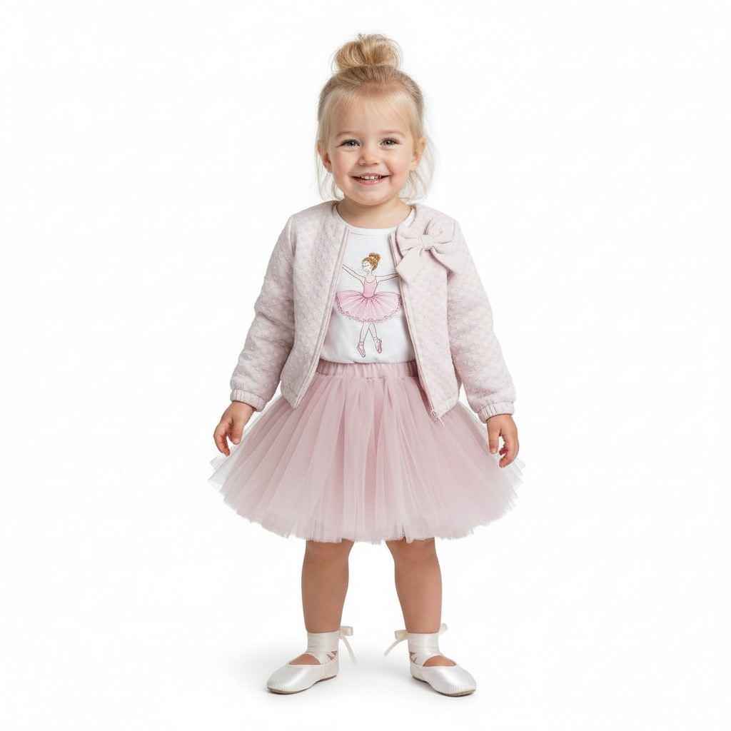 Ovaj prekrasan 3-dijelni set za djevojčice od 1 do 4 godine sastoji se od mekane jaknice, majice s printom balerine i til suknjice. Dizajniran za udobnost i eleganciju, idealan je za svečane prilike, ali i svakodnevno nošenje.