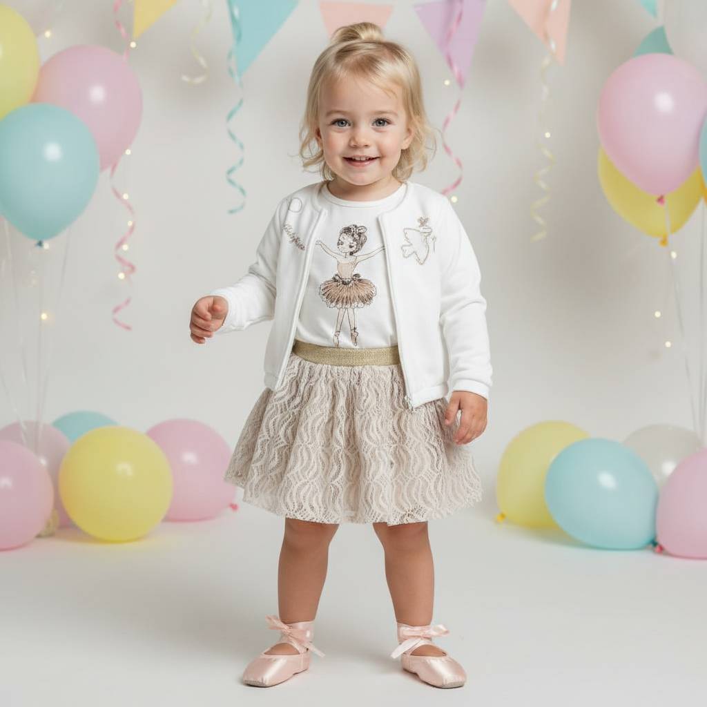 Ovaj predivan dječji set za djevojčice u dobi od 1 do 4 godine spaja eleganciju i udobnost, savršen za posebne prigode ili svečane izlaske. Set uključuje nježni bijeli kardigan s ukrasnim detaljima, majicu s romantičnim printom i bež čipkastu suknju koja dodaje dašak sofisticiranosti.