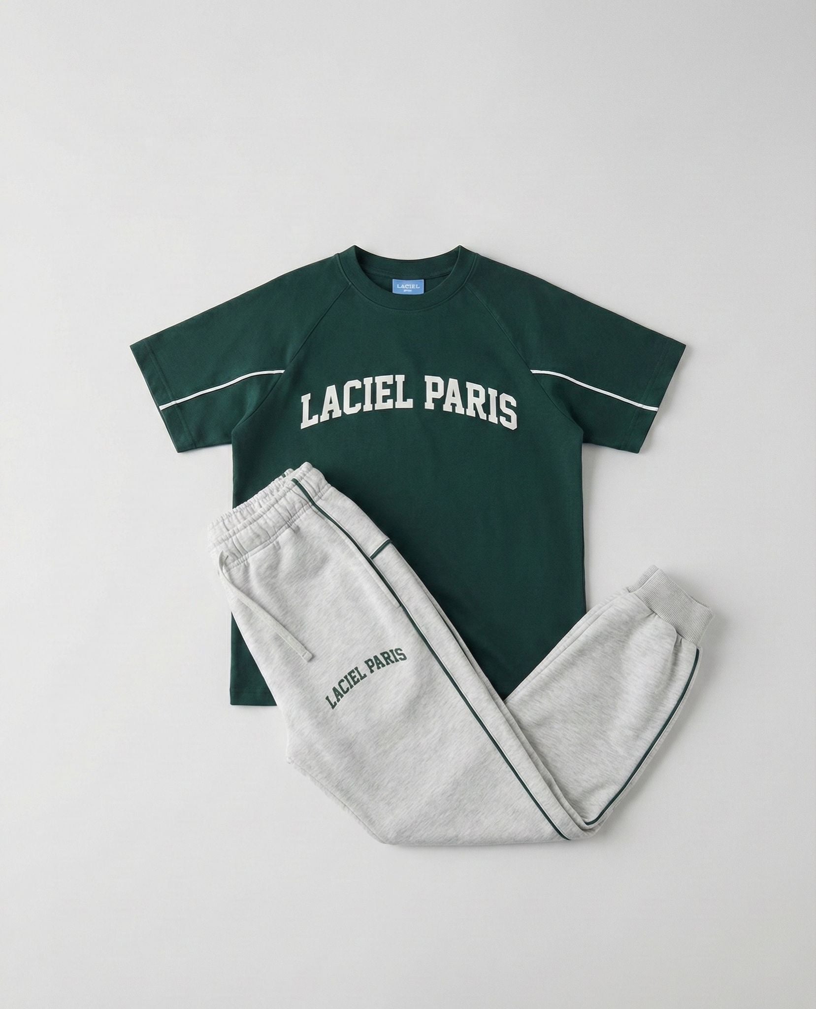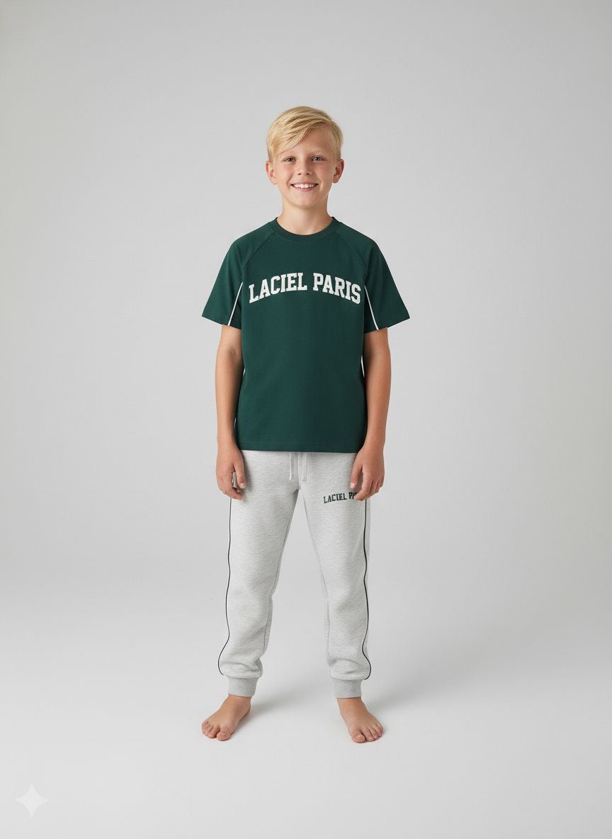 Minimalistički “athleisure” set za djecu: tamnozelena majica s raglan rukavima i velikim natpisom LACIEL PARIS, uparena sa sivim jogger hlačama s tankim kontrastnim paspulom. Komplet je osmišljen kao gotov outfit za školu, putovanja i svakodnevne aktivnosti – maksimalna nosivost uz čist, moderan izgled.