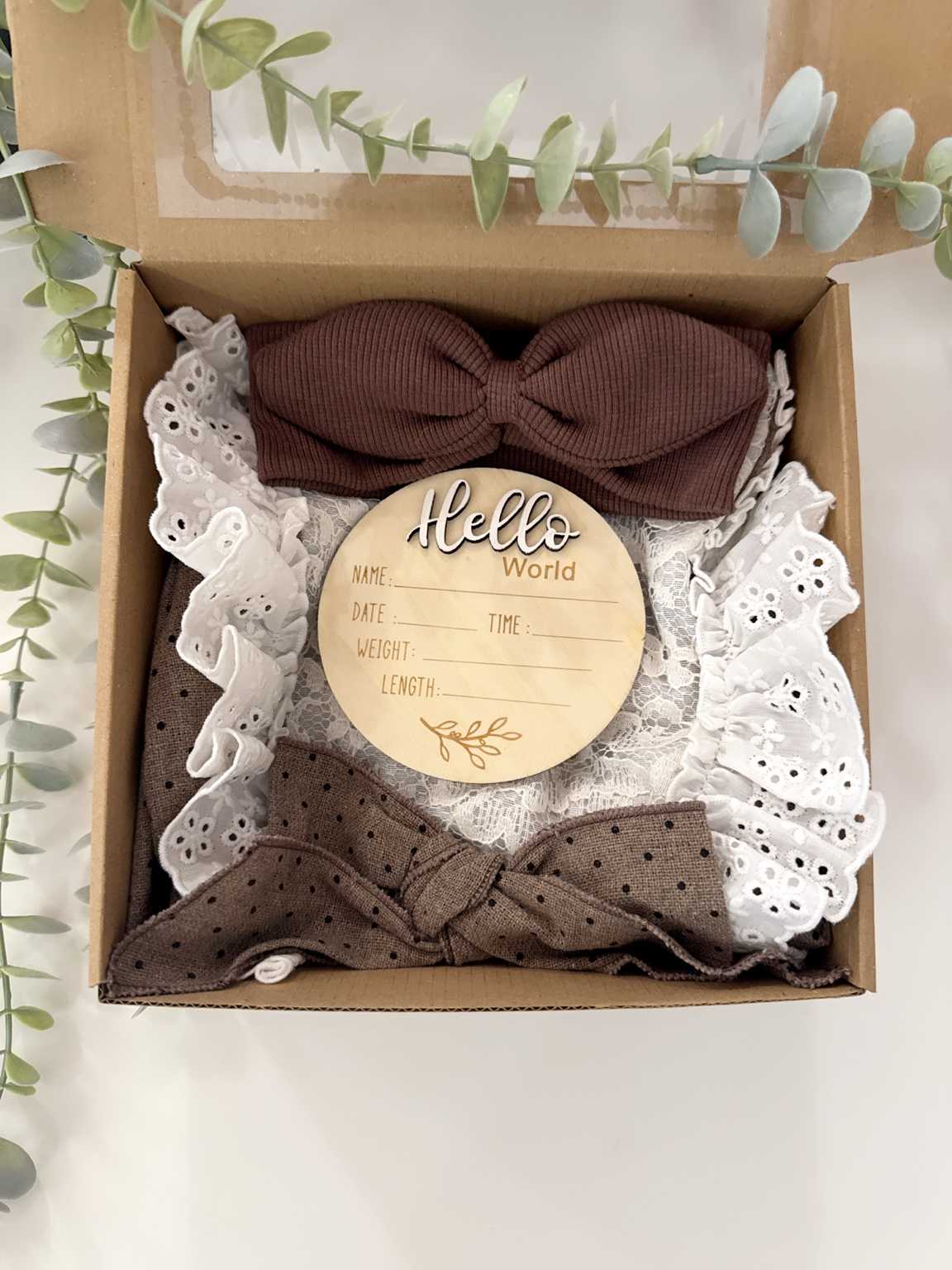 Pakiranje – komplet dolazi pažljivo aranžiran u čvrstoj poklon kutiji, ukrašen zelenilom i svilenim papirom. U paketu se nalazi i drvena pločica “Hello World” s prostorom za upisivanje imena, datuma i težine bebe – savršena uspomena i dodatak za prve fotografije.