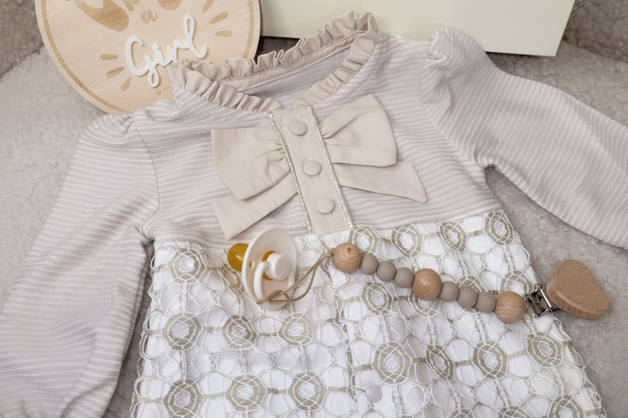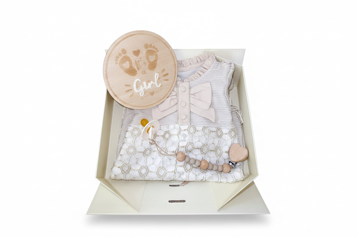 Soft Lace” je premium poklon set za novorođenče koji kombinira nježne, neutralne tonove i elegantne detalje – idealno za rođenje, baby shower i prve uspomene. U centru seta je mekani kombinezon s profinjenom mašnom i čipkastim uzorkom koji daje svečani, ali i dalje udoban look. Set je upotpunjen dudom te lančićem s drvenim perlicama i kopčom u obliku srca, uz dekorativnu drvenu pločicu „It’s a Girl” za fotografije i uspomene. Sve dolazi uredno zapakirano i spremno za darivanje.