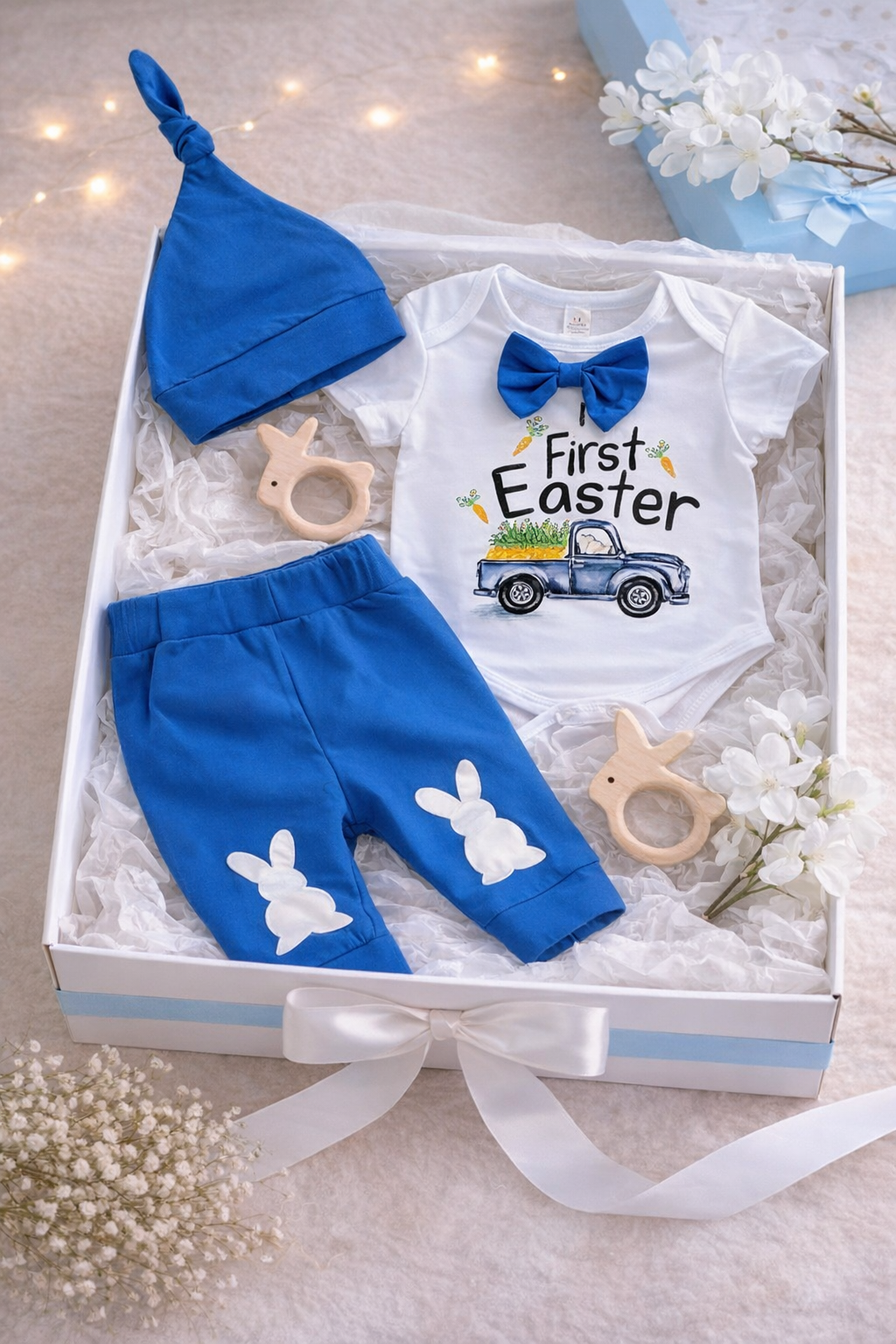 • Bodi s natpisom “My First Easter” i simpatičnim printom kamiona s mrkvama, ukrašen plavom leptir-mašnom.